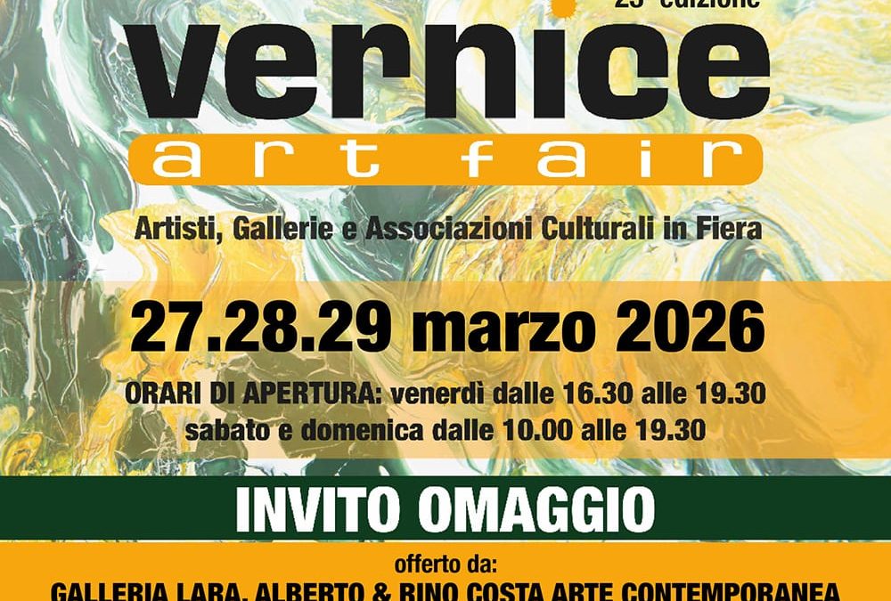 ART PARMA FAIR 22° EDIZIONE23 Febbraio 2026PAVIART 13° Mostra Mercato d’Arte Moderna e Contemporanea13 Marzo 2026 13 Marzo 2026 LA GALLERIA LARA, ALBERTO E RINO COSTAsarà presente a Vernice Art Fair 23° Edizione 27 – 28 – 29 marzo 2026 Fiera di Forlì Apertura al pubblico Venerdì 27 marzo dalle ore 16,30 alle ore 19,30Sabato e domenica dalle ore 10,00 alle ore 19,30 Condividi Articoli correlati13 Marzo 2026PAVIART 13° Mostra Mercato d’Arte Moderna e ContemporaneaLeggi23 Febbraio 2026ART PARMA FAIR 22° EDIZIONELeggi20 Gennaio 2026ARTE FIERA BOLOGNA 2026Leggi